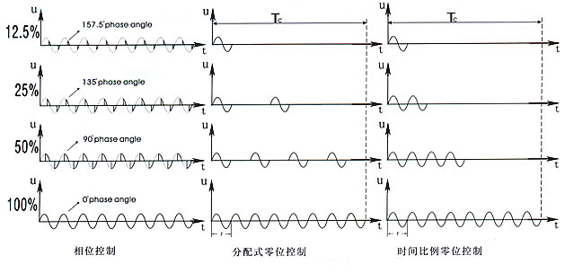 按照輸入電壓散布的差別,零位節制又分為分派式零位節制,既在Tc周期內按照輸入百分比均勻散布周波;時候比例零位節制則在Tc周期內按照輸入百分比持續接通幾個周波,而后在Tc周期殘剩的時候內持續關掉幾個周波。